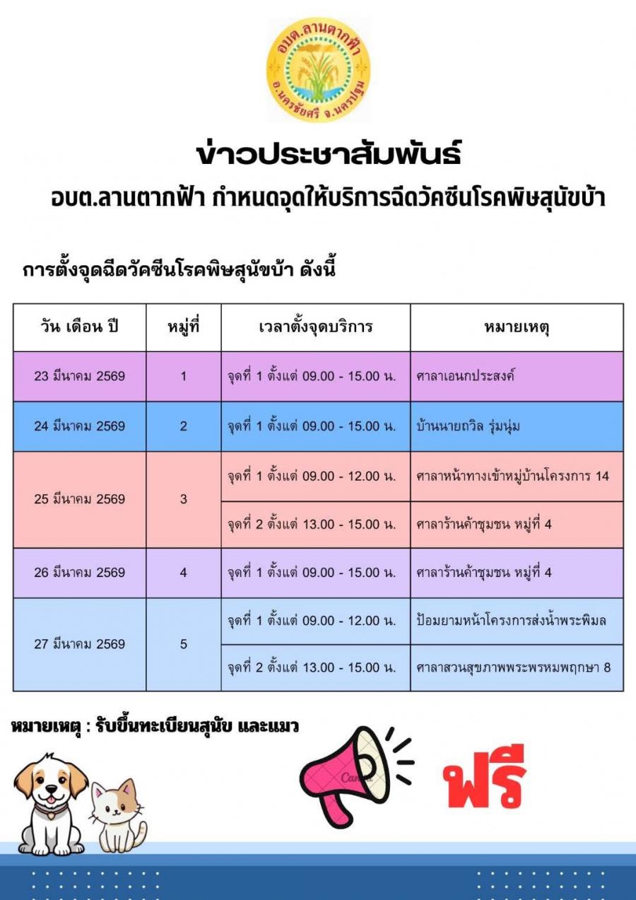 วันที่ 26 มีนาคม 2569 องค์การบริหารส่วนตำบลลานตากฟ้า ลงพื้นที่ให้บริการฉีดวัคซีนโรคพิษสุนัขบ้า หมู่ที่ 4 ณ ศาลาร้านค้าชุมชน หมู่ที่ 4
